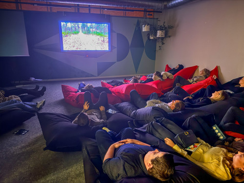 Inclusief kussens en/of zitzakken; zachte texturen die uitnodigen tot ontspanning en een advies qua ruimte/opzet.